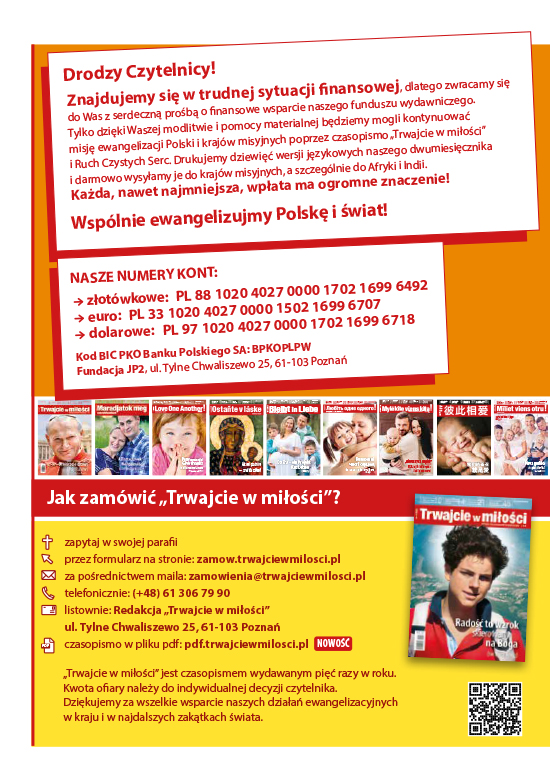 Pan Bóg do każdego człowieka kieruje przesłanie miłości. Ufamy, że artykuły i świadectwa zamieszczone w czasopiśmie „Trwajcie w miłości” pomogą w odkryciu i przyjęciu do serca tej prawdy. Zapraszamy do lektury!