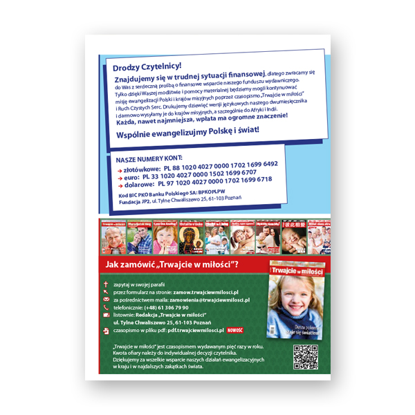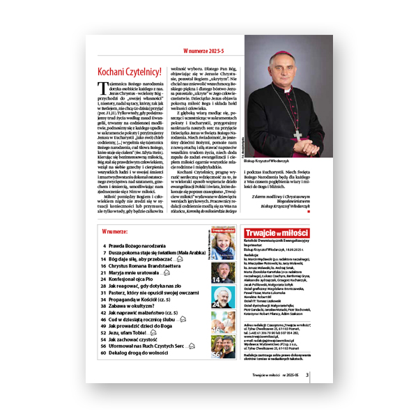 Z głęboką wiarą przygotujmy nasze serca na przyjęcie Dzieciątka Jezus w Święta Bożego Narodzenia. Mamy nadzieję, że w tym zadaniu pomogą artykuły i świadectwa umieszczone w „Trwajcie w miłości” (5-2025). Zapraszamy do lektury!